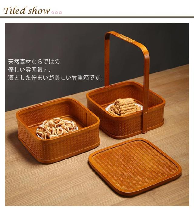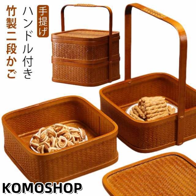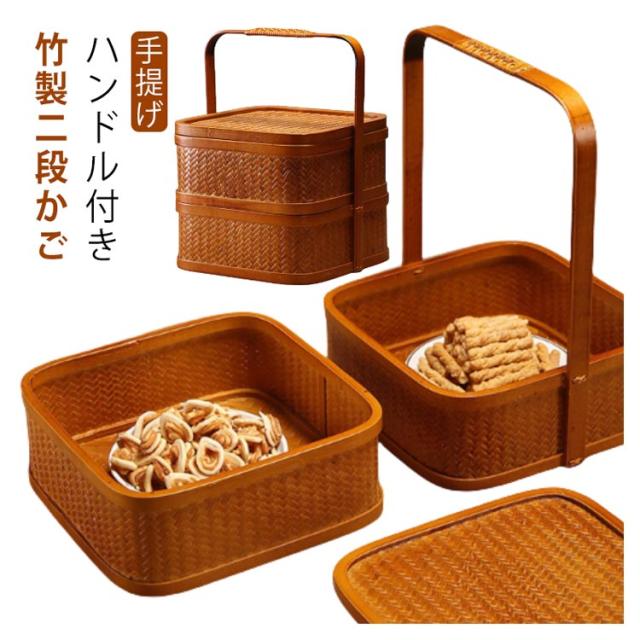 | ハンドル付き 竹製二段かご 天然素材ならではの優しい雰囲気と、凛とした佇まいが美しい竹重箱です。 程よい深さがあるので、記念日などにオードブルを入れる箱物としてお使いいただくこともできます。 | |