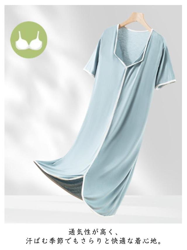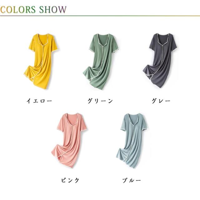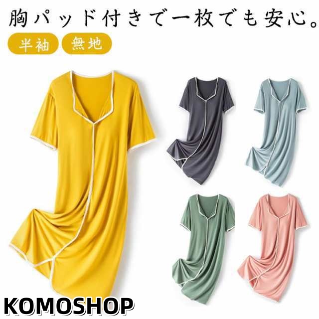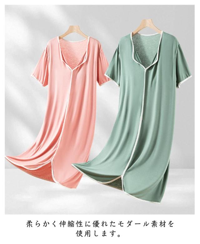 胸パッド付き ルームワンピース レディース Vネック 半袖 モダール パジャマ ネグリジェ 無地 テーラード襟 ミモレ丈 ナイトワンピース ルームウェア 部屋着 ゆったり 婦人用 マタニティ 入院 春夏