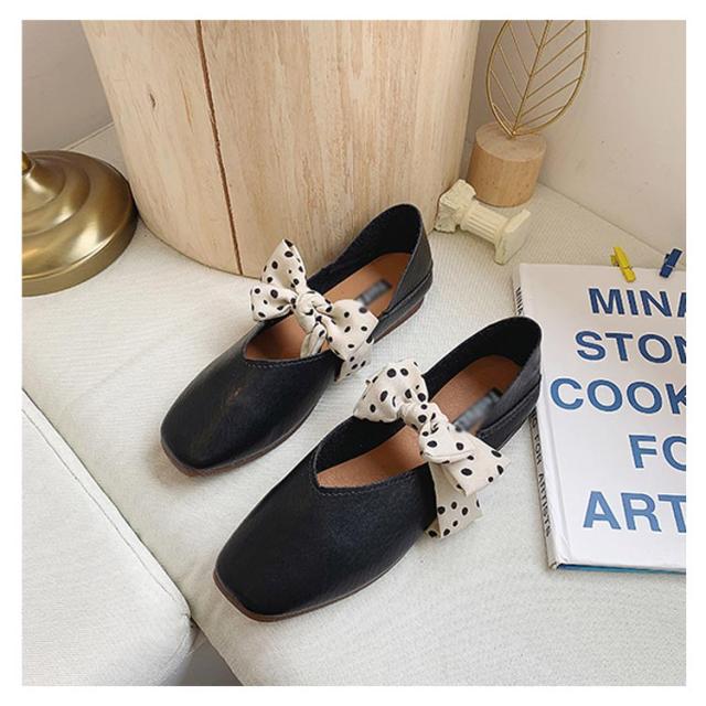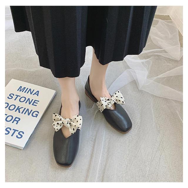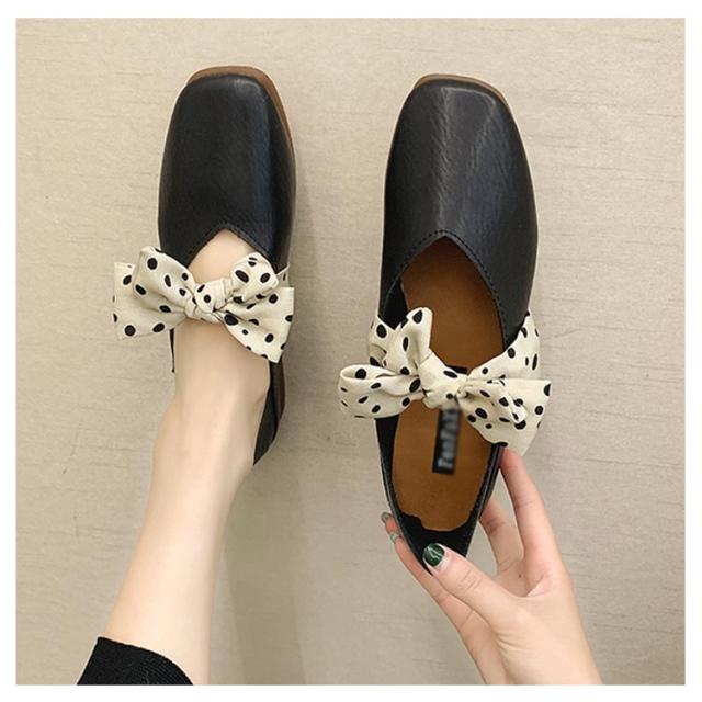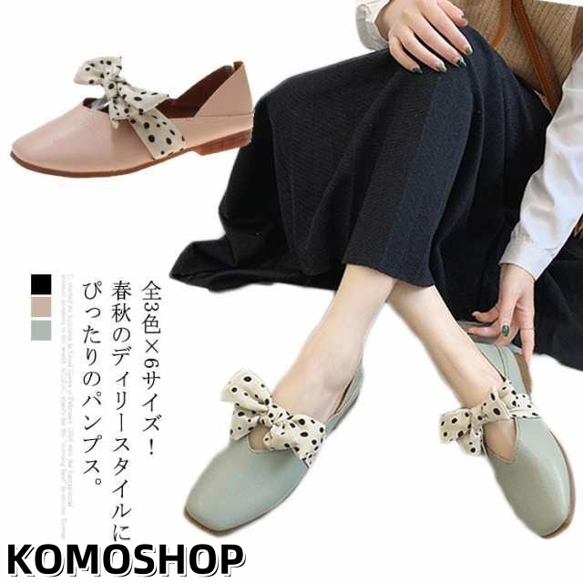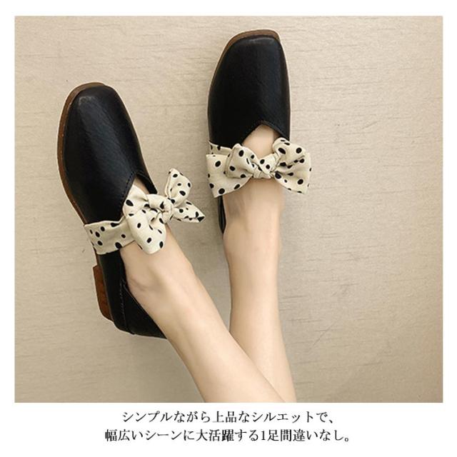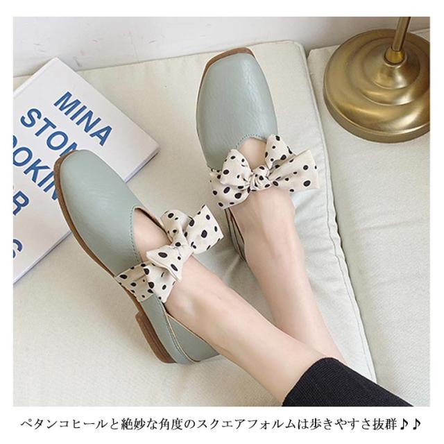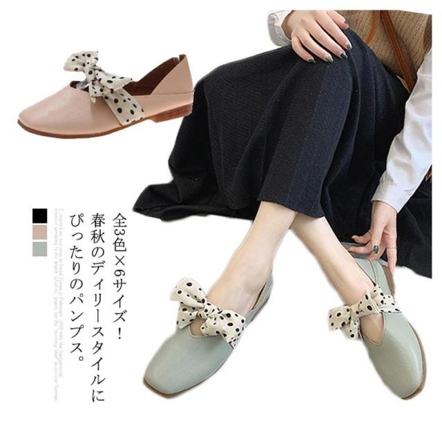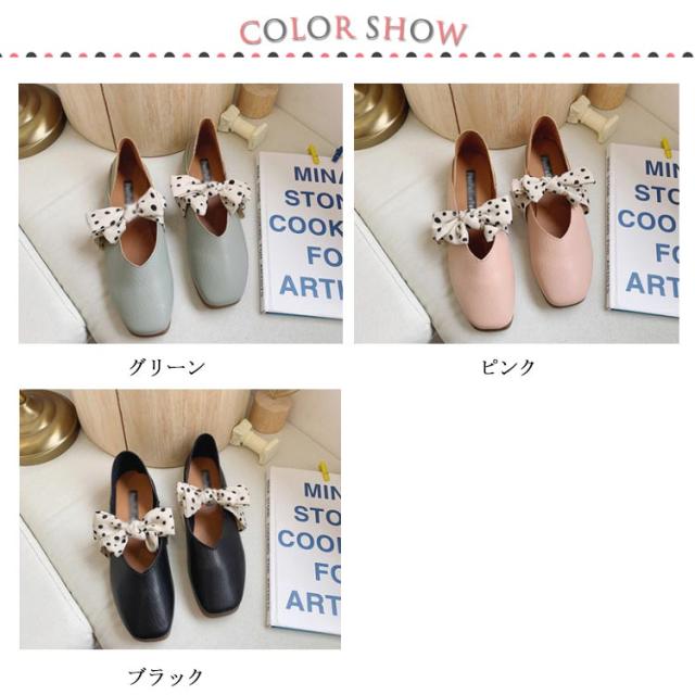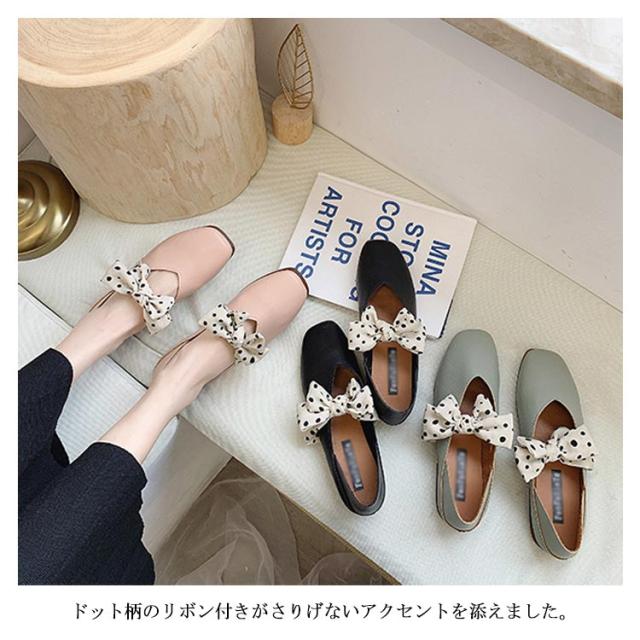 全3色×6サイズ!ドット柄リボン付 パンプス 痛くない ペタンコ ぺたんこ スクエアトゥパンプス ローヒール カジュアル靴 レディース 歩きやすい 春 秋