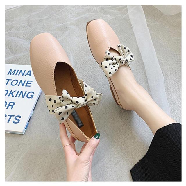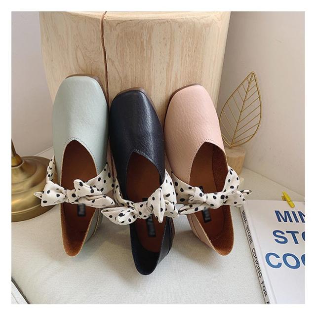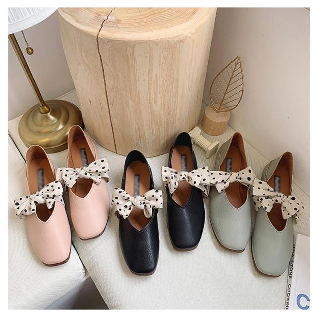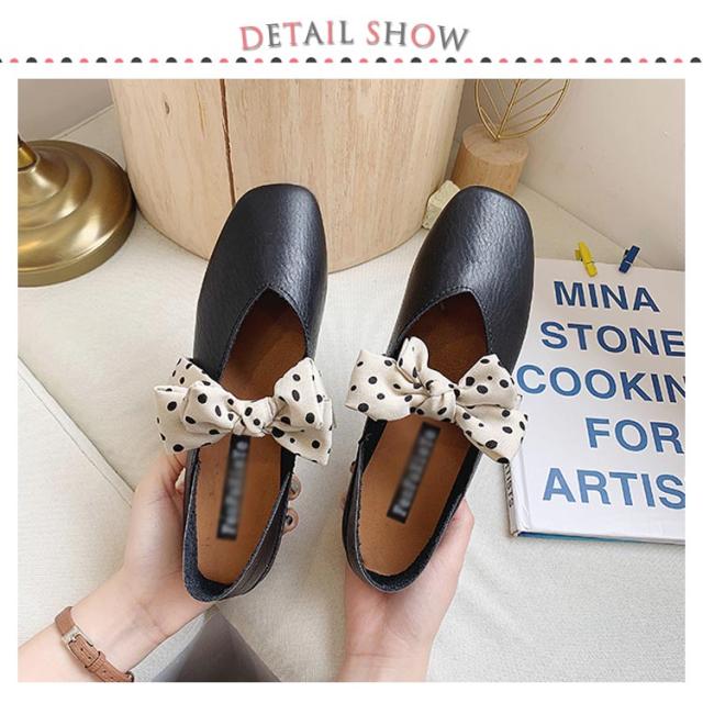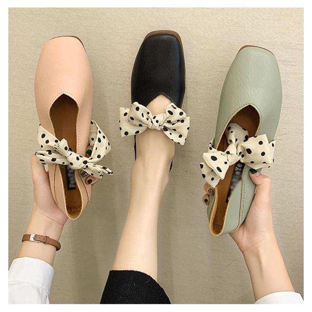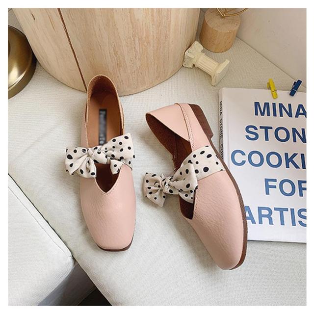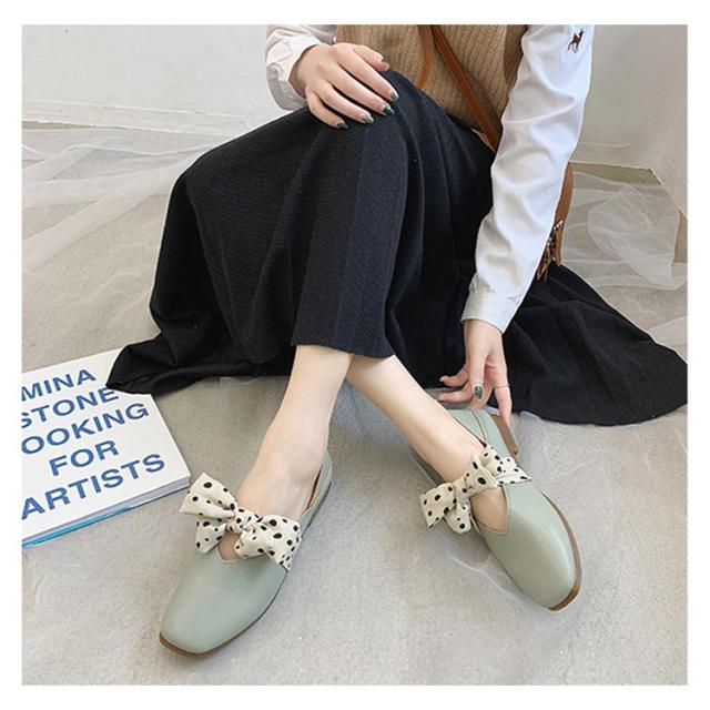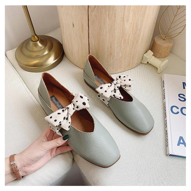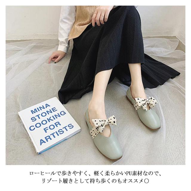 全3色×6サイズ!ドット柄リボン付 パンプス 痛くない ペタンコ ぺたんこ スクエアトゥパンプス ローヒール カジュアル靴 レディース 歩きやすい 春 秋