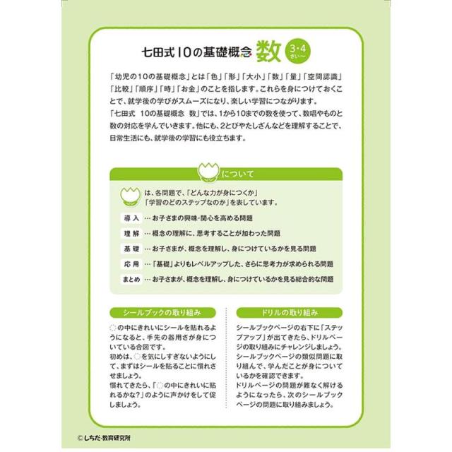 ・「色」「形」「大小」「数」「量」「空間認識」「比較」「順序」「時」「お金」の10の基礎概念。