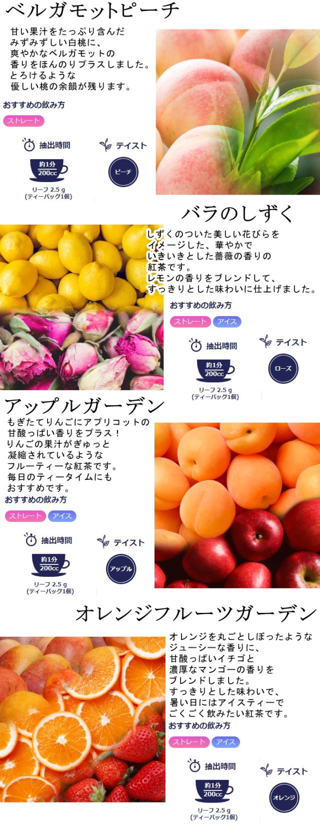 イングリッシュブレックファースト・ダージリン・ミルキッシュクレメ・アールグレイ・エンジェルジャスミン・フレンチマスカット・ベルガモットピーチ・バラのしずく・アップルガーデン・オレンジフルーツガーデン