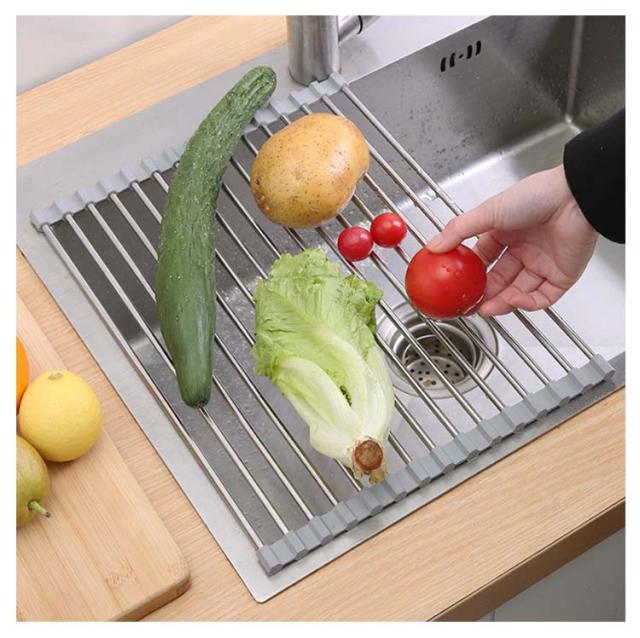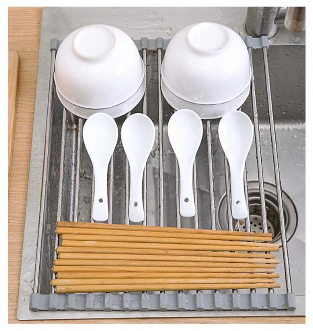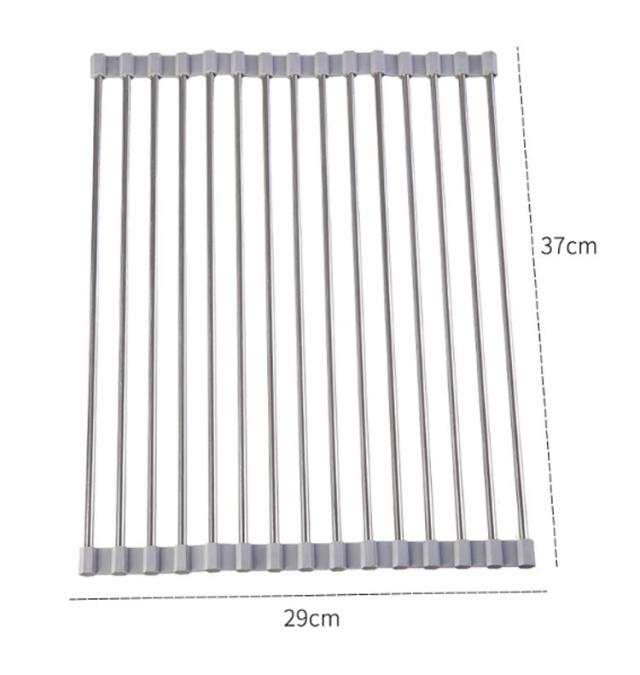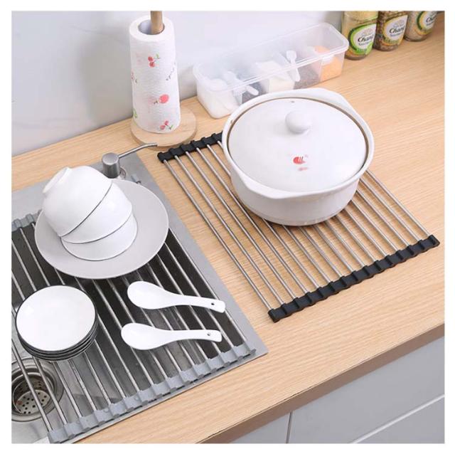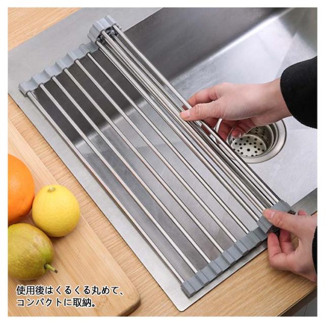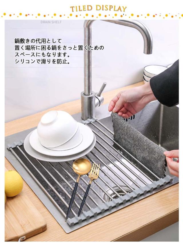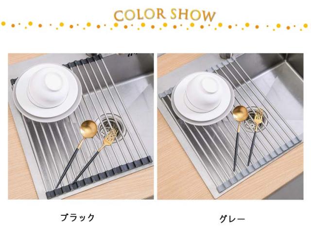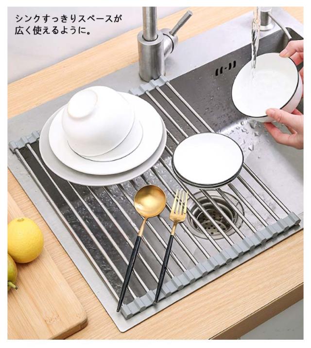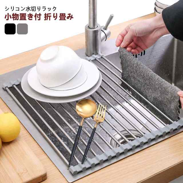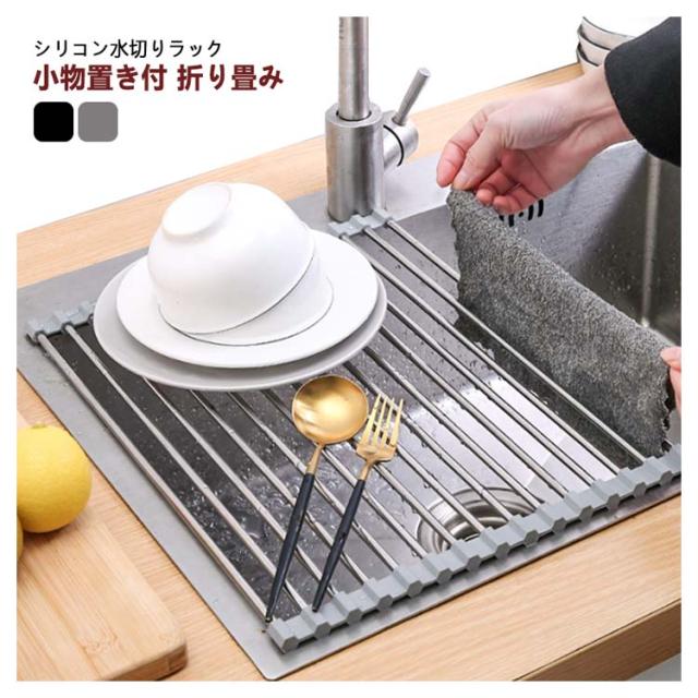 | シリコン水切りラック 小物置き付 折り畳み 使用後はくるくる丸めて、コンパクトに取納。 シンクすっきりスペースが広く使えるように。 鍋敷きの代用として 置く場所に困る鍋をさっと置くためのスペースにもなります。 シリコンで滑りを防止。 | |