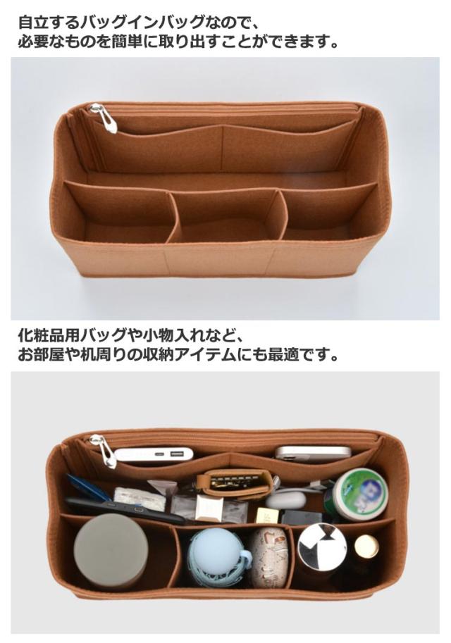 | 3タイプ×4色 から選べる フェルトインナーバッグ 広めのマチで毎日持ち歩くポーチや手帳などの小物をたっぷり収納できます。 大小さまざまなサイズのポケットなので、小物がぴったり収納できます。 しっかりしたフエルト生地により軽量で自立が可能となっております。 自立するバッグインバッグなので、必要なものを簡単に取り出すことができます。 化粧品用バッグや小物入れなど、お部屋や机周りの収納アイテムにも最適です。 | |