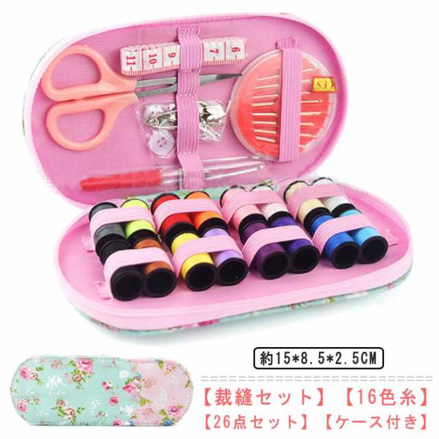 裁縫箱 裁縫セット ソーイングセット 16色縫い糸 裁縫道具 収納 コンパクト 薄型タイプ 小学生 小学校 女の子 女子 家庭科 携帯用 持ち歩き用 応急処置 花柄 総柄 かわいい シンプル ピンク グリーン 送料無料