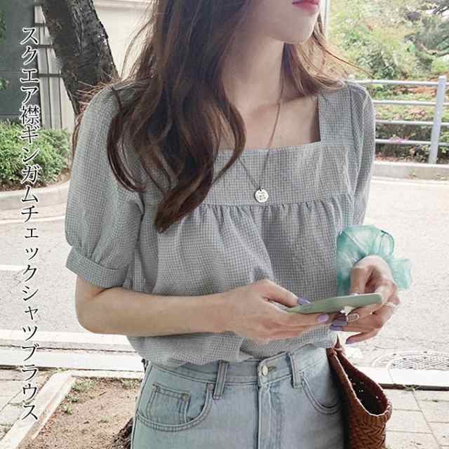 シャツブラウス チェックシャツ ギンガムチェック 半袖 スクエア襟 レディース トップス