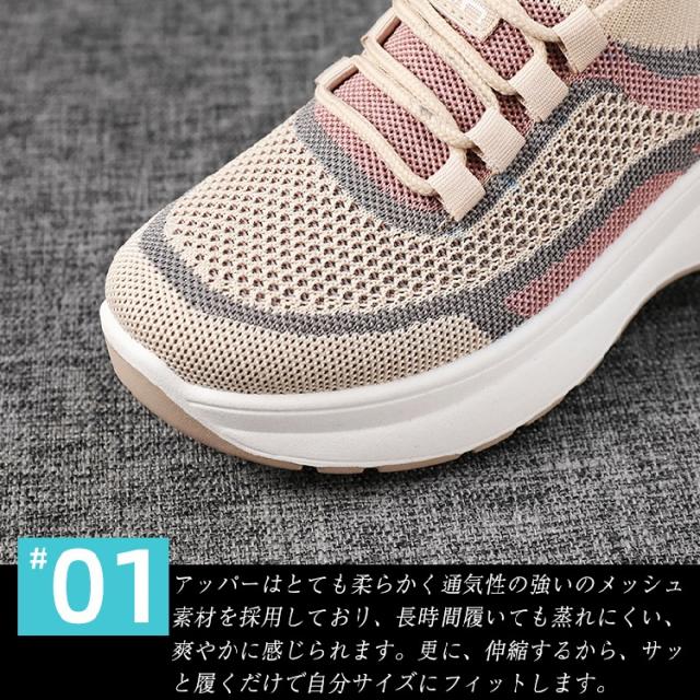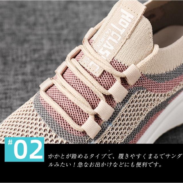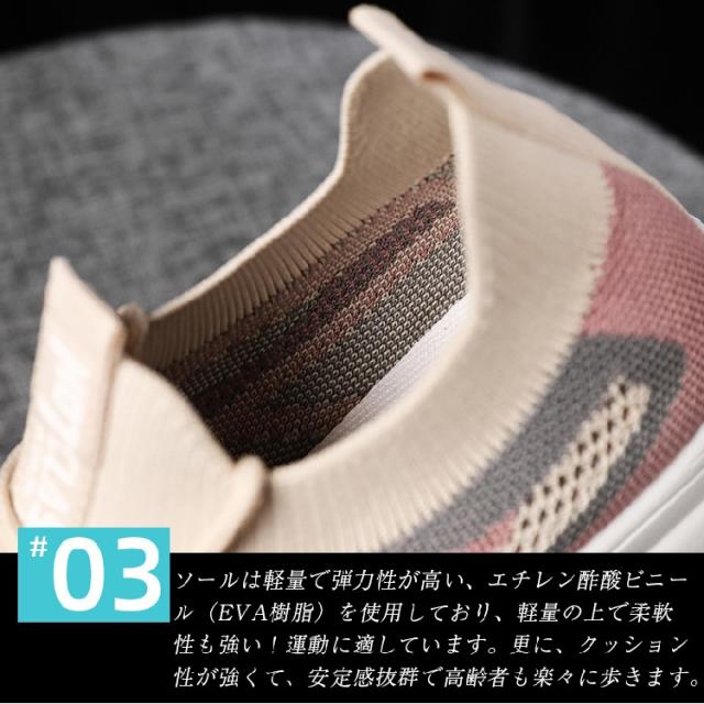 \point02 通気性抜群 メッシュ素材/アッパーはとても柔らかく通気性の強いのメッシュ素材を採用しており、長時間履いても蒸れにくい、爽やかに感じられます。更に、伸縮するから、サッと履くだけで自分サイズにフィットします。