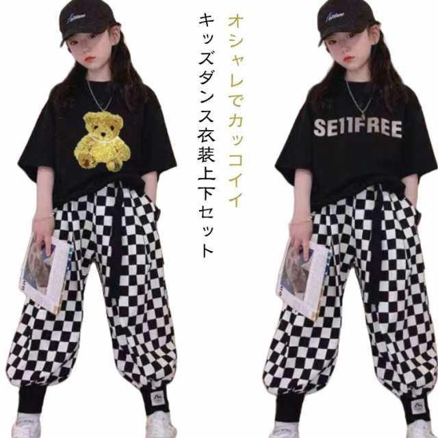 ダンス衣装 キッズ ダンス衣装 K-POP ダンス ヒップホップ キッズダンス ホワイト セットアップ ロングパンツ 韓国風 ダンス パンツ ブラック チェック柄 トップス キッズダンス衣装 キッズ セットアップ 2点セット 大きいサイズ ウエストゴム ギフト プレゼント