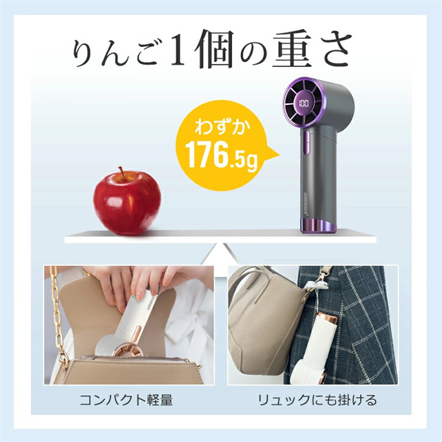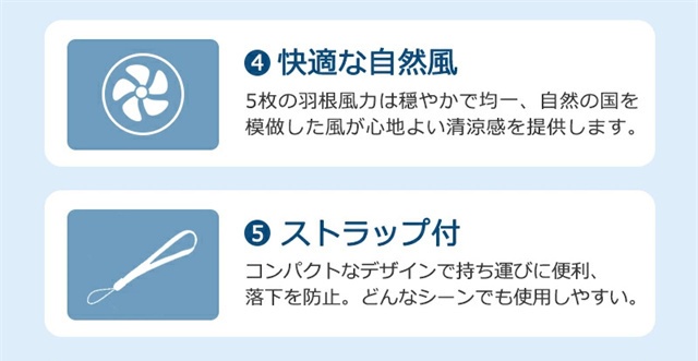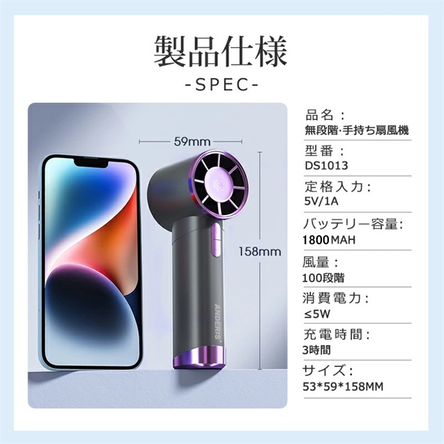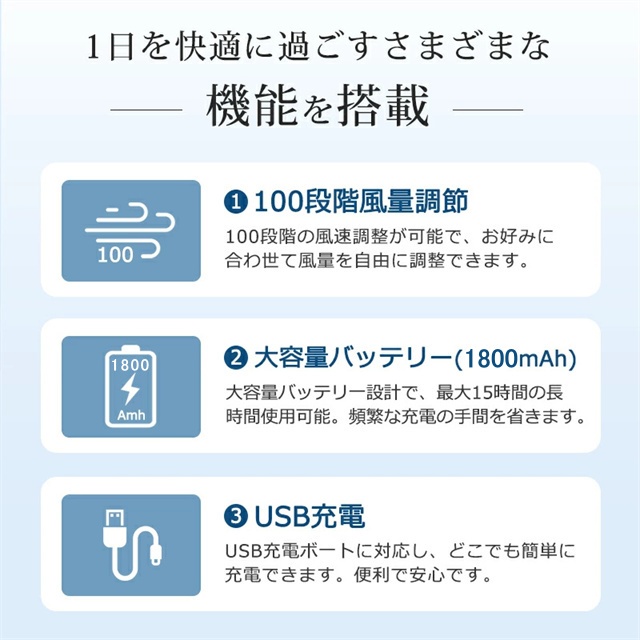 【スクロールスイッチ・100段階の風速調節】 この小型扇風機はスクロールスイッチ設計を採用し、風速を無段階に調整することができます。1〜100まで風速をカスタマイズでき、様々なシーンでの風力ニーズに応えます。強力なモーターを備えたタービン構造を採用し、吸い込んだ熱気を急速に圧縮して冷却し、冷風に変えて吹き出します。 これにより、暑い日に瞬時に冷却されます。 【1800mAh大容量バッテリー】 1800mAh大容量バッテリーを内蔵し、繰り返し充電して使用可能な充電式扇風機です。一回のフル充電で最大15時間まで連続送風可能、頼もしい電池持ちで一日中快適に。バッグや車に常備しておくと、いつでもどこでも涼しさを手に入れます。 【様々なシーンに大活躍】 176.5gの軽量設計、暑い季節、オフィスや外出時に大活躍!真夏のフェスやアウトドア、現場ライブ、スポーツ観戦、散歩、山登り、遠足、 お祭りや日常生活でのガーデニング、お風呂上り、お化粧時、家事の時、通勤、通学、オフィスなどあらゆる場面で活躍するアイテムです。いつでもどこでも夏の涼しさを楽しくて、お時間が楽に過ごすことができます。 |