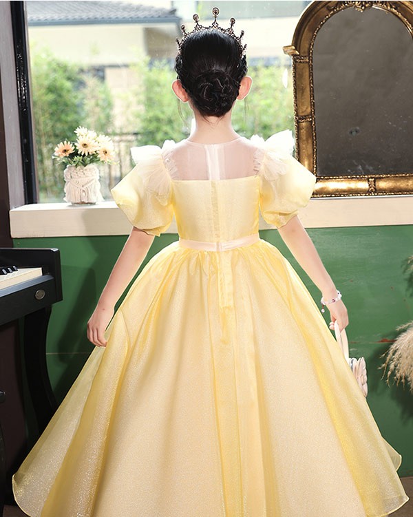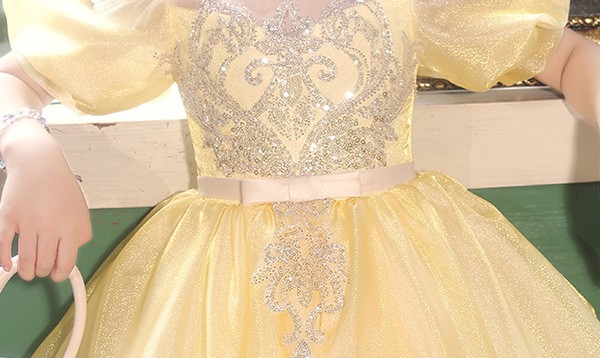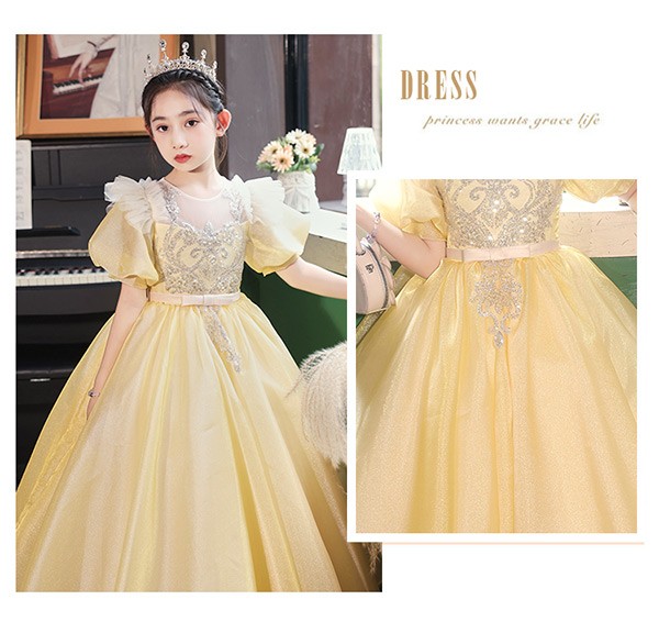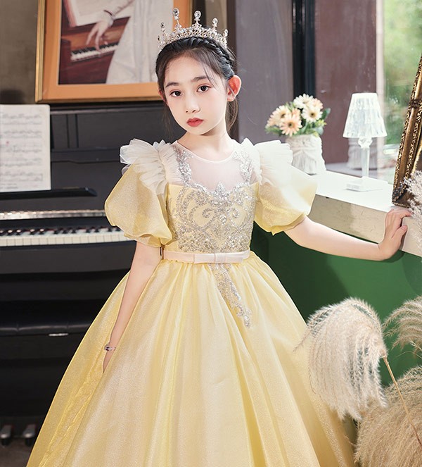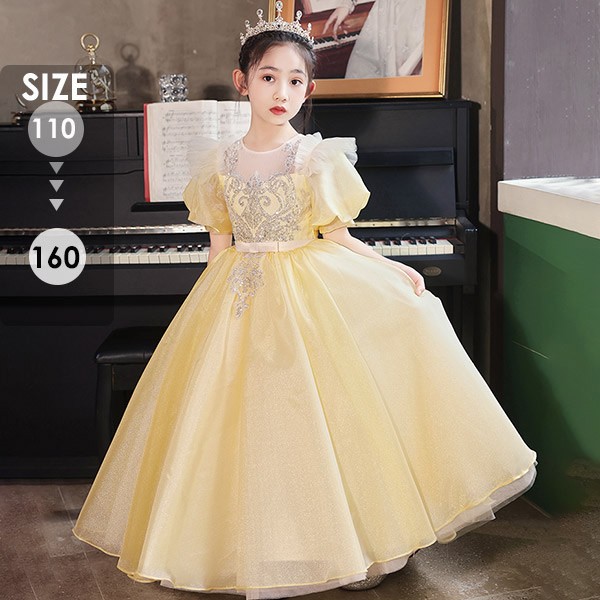ワンピース 半袖 キッズドレス ピアノ 発表会 子供ドレス キッズ 子ども 可愛い 女の子 女児 ロング丈ドレス 合唱 披露 イエロー ステージ衣装 演出 演奏会 音楽会 パーティー 110 120 130 140 150 160