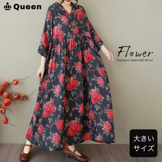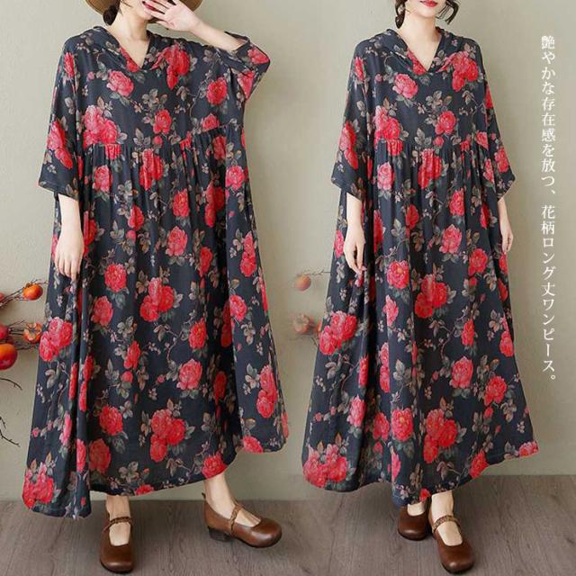 ワンピース レディース ロング丈 花柄 五分袖 綿混 ゆったり 大きいサイズ (248104)