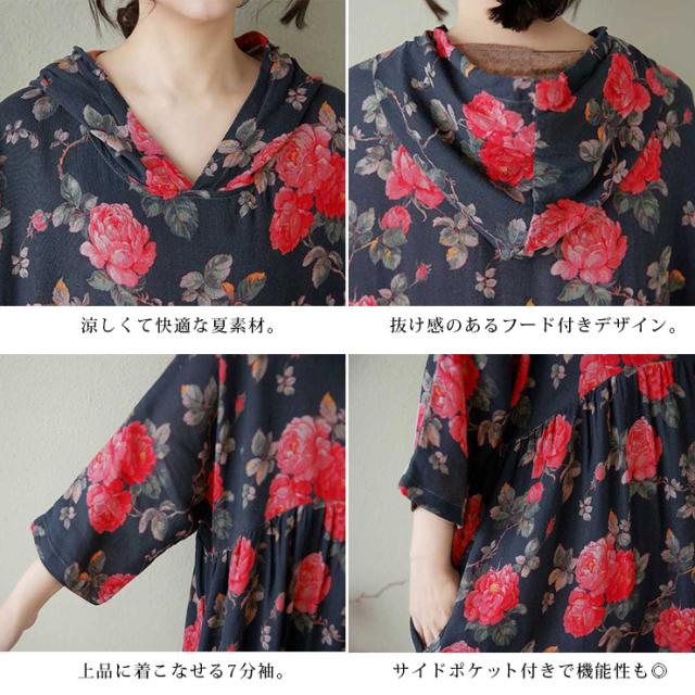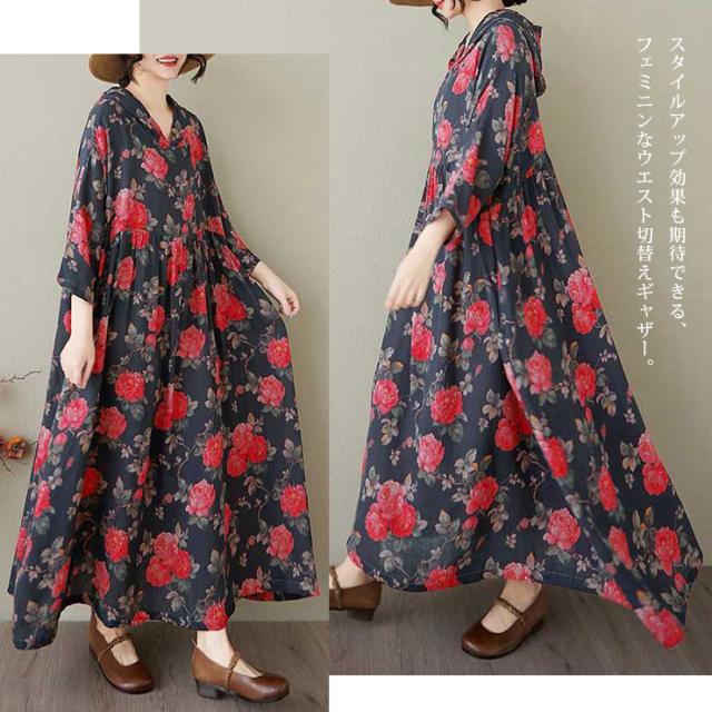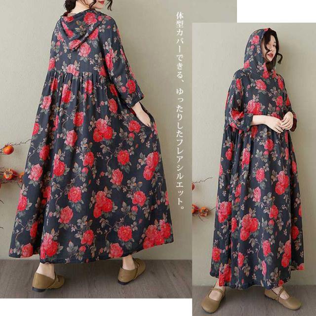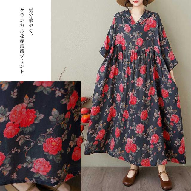 薔薇柄フードつきワンピース