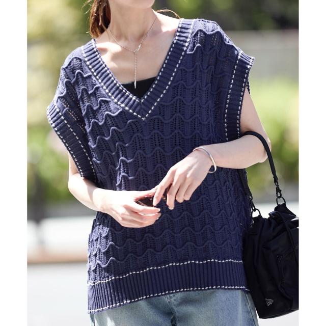・ウェーブ柄の透かし編みニットベスト。