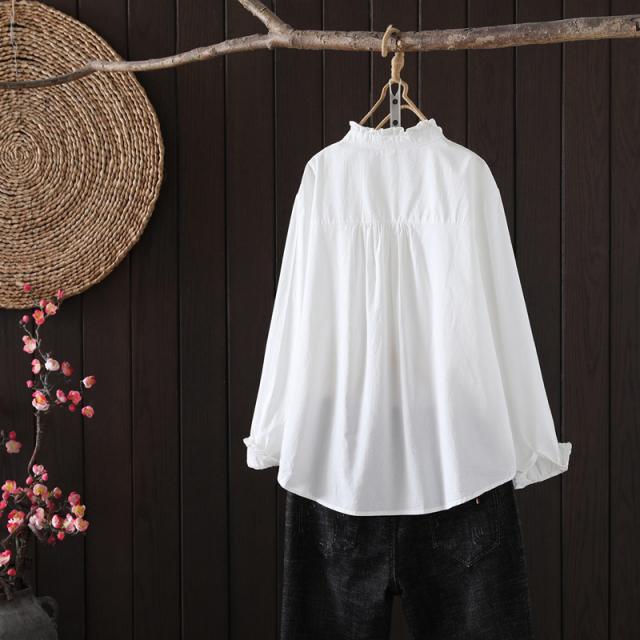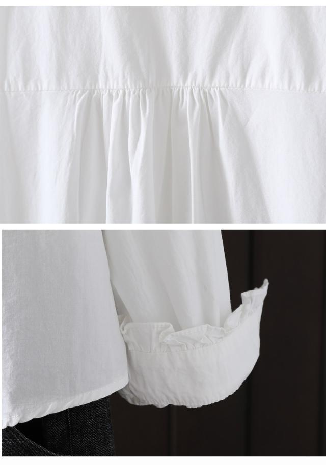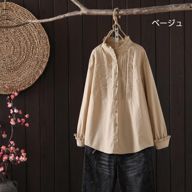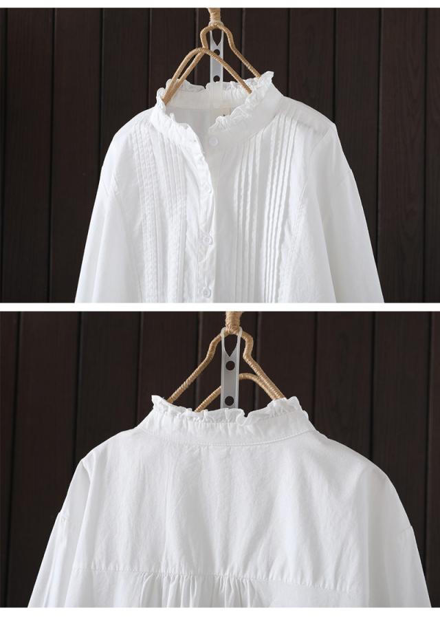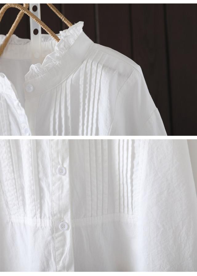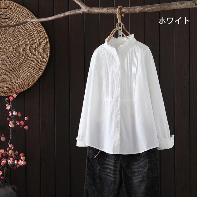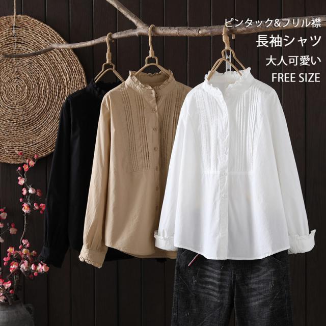 長袖シャツ レディース フリル フリルブラウス シャツ ピンタック 長袖ブラウス 長袖 フリルネック ブラウス 無地 ドッキング シャツブラウス 綿 コットン トップス 前開き 体型カバー 白シャツ