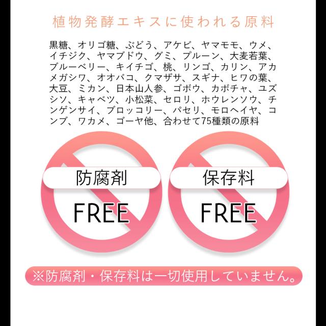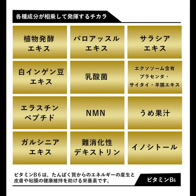 | 原材料名 | フラクトオリゴ糖シロップ(国内製造)、難消化性デキストリン、エリスリトール、寒天、うめ果汁、サラシアエキス、白インゲン豆エキス、乳酸菌末(殺菌)、植物発酵エキス、エクソソーム含有プラセンタ・サイタイ・羊膜エキス、エラスチンペプチド、NMN、りんご抽出物、ガルシニアエキス、パロアッスルエキス/酸味料、ゲル化剤(増粘多糖類)、香料、甘味料(ステビア)、カラメル色、イノシトール、ビタミンB6、(一部にキウイフルーツ・大豆・もも・りんごを含む) |