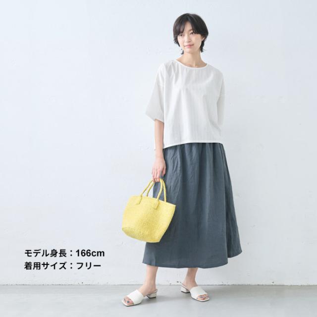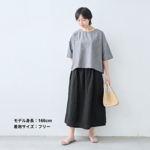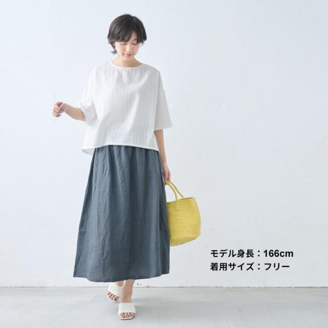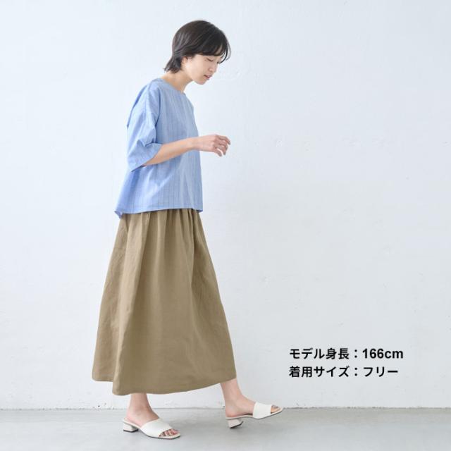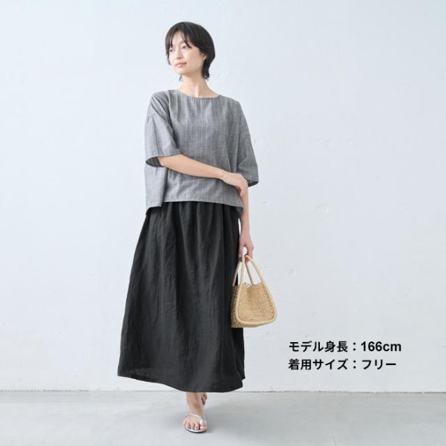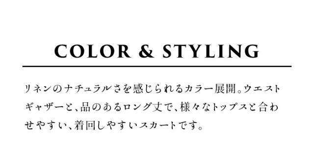 特徴 細番手のフレンチリネンを使用した、ナチュラルなシワ感が魅力のロングスカート。柔らかな肌触りで通気性が良いので、風を感じる心地よい着心地です。長めの丈は、どんなシーンにも合わせやすく、シンプルなデザインでありながらも洗練された、どこかこなれた雰囲気です。暑い日にも、風を感じながら、軽やかに歩ける、大人のリネンスカートです。