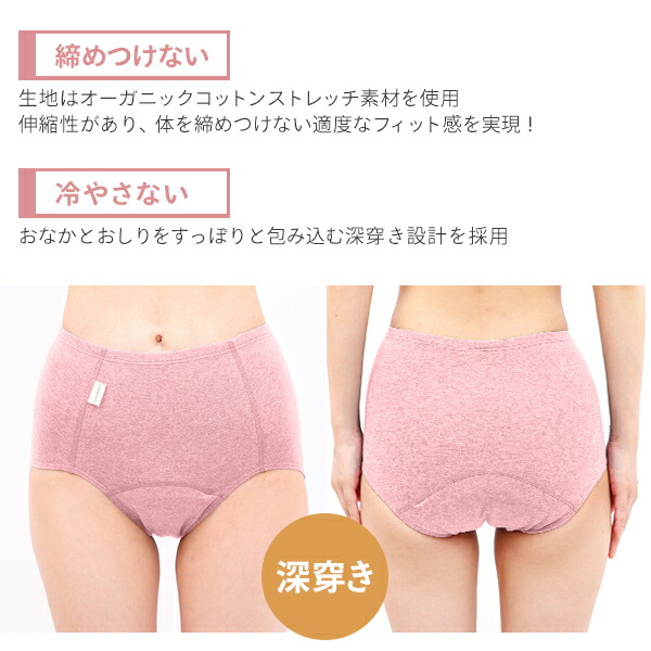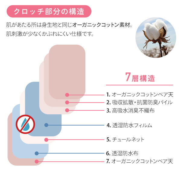 | 商品説明 | ●生地には伸縮性があるオーガニックコットンストレッチ素材を使用 ●おなかとおしりをすっぽり包み込む深穿き設計 ●独自の7層構造でショーツ本体がしっかり水分を吸収 ●吸水量目安:約45cc ●紙ナプキンとの併用も可能 ※完全に漏れを防げるショーツではありません ※お肌に合わないときはご使用を中止してください ※洗濯せずに使用すると、うまく水分を吸収できない可能性がありますのでご使用前に必ず洗濯してください |