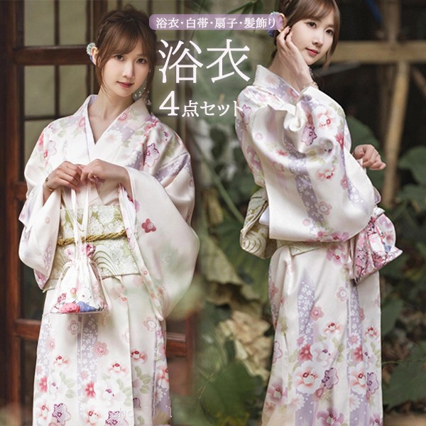 4点セット 浴衣 2025新作 浴衣4点セット ゆかた 白帯 浴衣セット イベント 花火大会 扇子 髪飾り