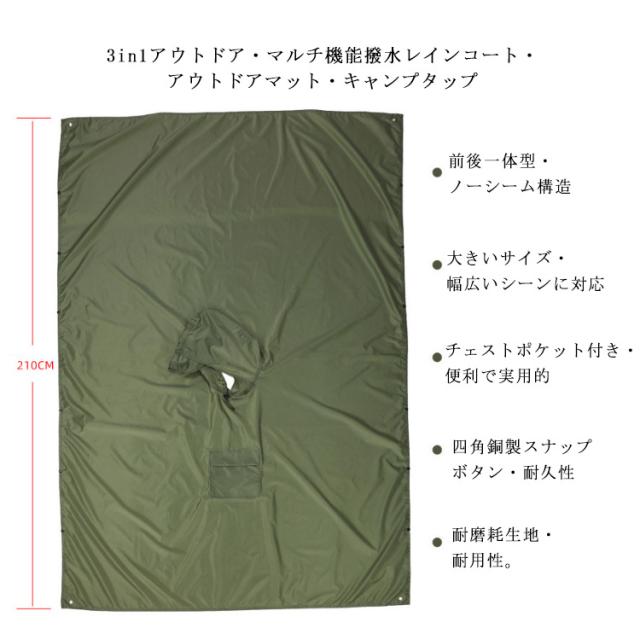 | 3in1マルチ機能 撥水レインコート/アウトドアマット/キャンプタップ 3in1アウトドア・マルチ機能撥水レインコート・アウトドアマット・キャンプタップ。 利用シーンはいろいろ、自転車やバイクでの通勤・通学、釣りや登山などのアウトドアで大活躍します。 収納袋が付き、収納に便利で、レインコート着用時の収納袋としても使えます。 | |