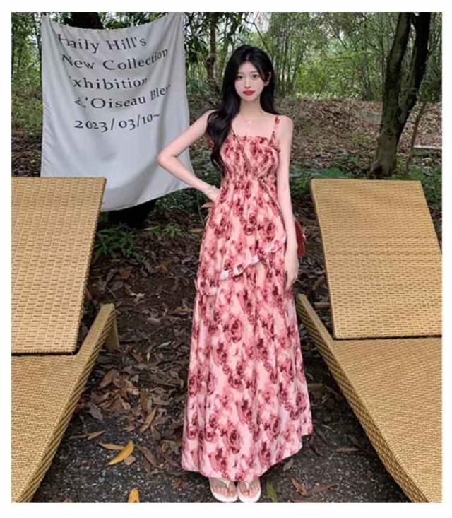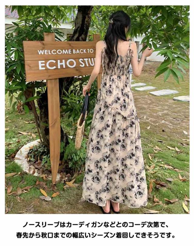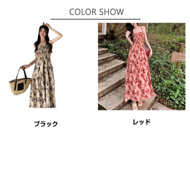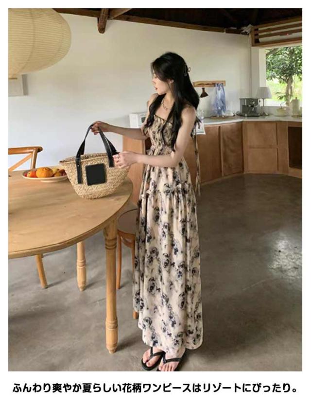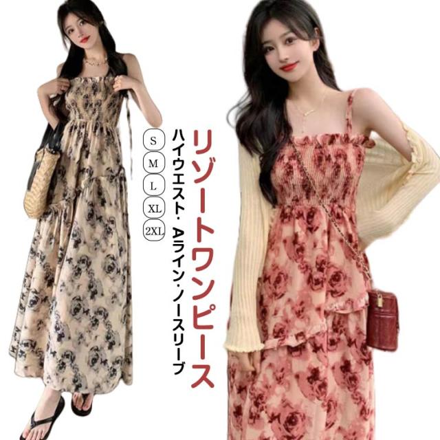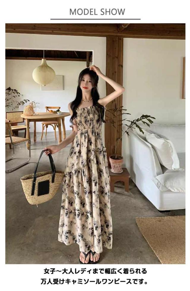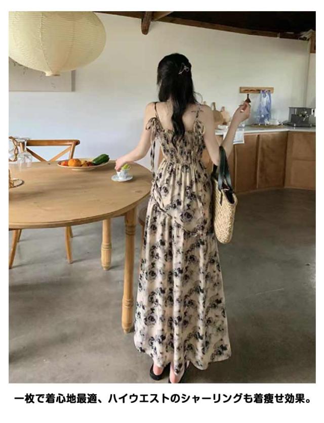 ロングワンピース キャミソールワンピース 夏 リゾートワンピース レディース マキシ丈ワンピース ワンピース ノースリーブ エレガント Aライン フェミニン ハイウエスト 可愛い お洒落 花柄 シャーリング ふんわり 30代 薄手 20代 ワンピース 40代