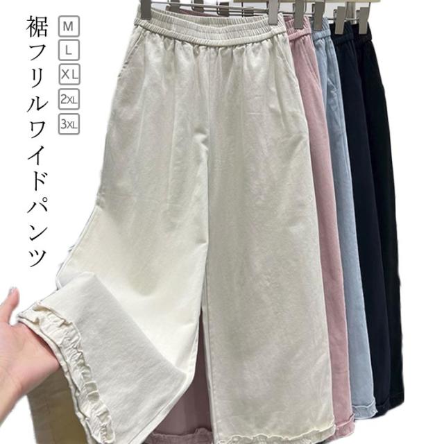 綿 レディース パンツ 裾 九分丈 コットン 長ズボン 楽ちん ロング丈 フリル ウエストゴム ワイドパンツ ズボン 可愛い 無地 リラックスパンツ 大人 体型カバー 春
