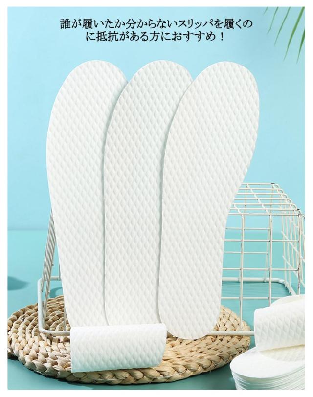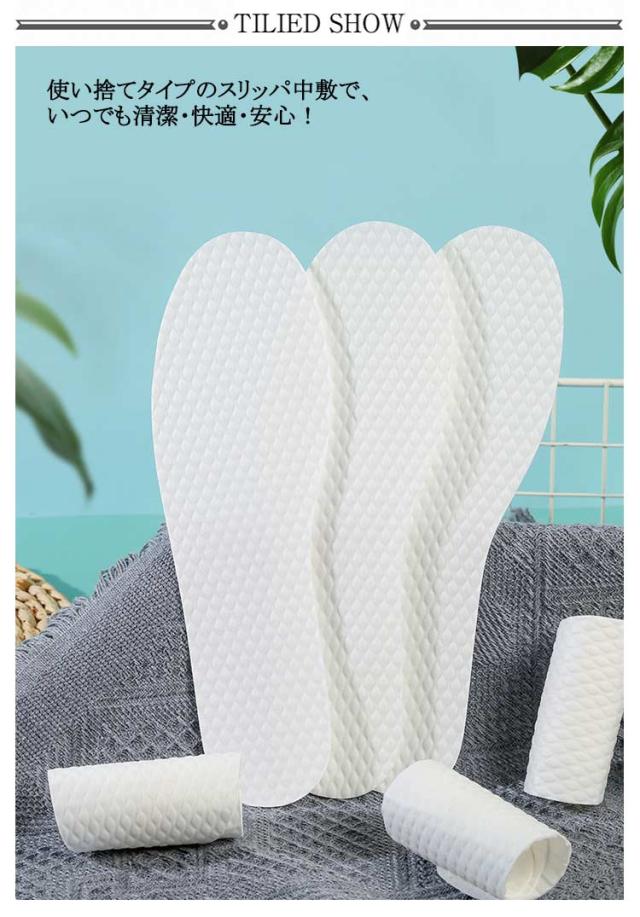 | 100枚入 50足分セット 使い捨てインソール。 使い捨てタイプのスリッパ中敷で、いつでも清潔・快適・安心! 衛生的な使い捨てのスリッパ中敷です。 滑り止めが付いていますのでスリッパにフィットしやすく、簡単に着脱できます。 誰が履いたか分からないスリッパを履くのに抵抗がある方におすすめ! | |