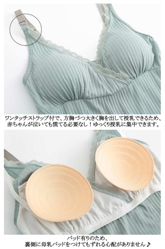 | 使いやすさバツグンの授乳タンクトップ 肌触りのよい生地なので、授乳中のデリケートなお肌も赤ちゃんにも安心して着用していただけます。 ノンワイヤーで苦しくないのに、大きくなったバストをしっかりホールドしてくれます。 パッド有りのため、裏側に母乳パッドをつけてもずれる心配がありません♪ ワンタッチストラップ付で、方胸づつ大きく胸を出して授乳できるため、赤ちゃんが泣いても慌てる必要なし!ゆっくり授乳に集中できます。 幅広のストラップで付け心地も良くサイズ調整もできます。卒乳後も、ブラキャミとしてお使いいただけます。 バストをしっかりホールドしてくれるため、卒乳後のバストケアとしてもお使いすることが出来ます! | |
