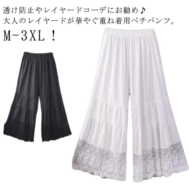 | M-3XL!透け防止やレイヤードコーデにお勧め♪大人のレイヤードが華やぐ重ね着用ペチパンツ。 ゆったりワイドシルエットで着心地も楽々。 風を感じる裾レースで華やかにレイヤードを楽しむ1枚です。 | |