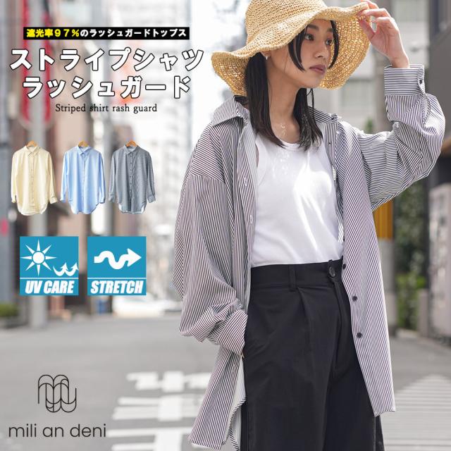 春新作 ストライプシャツラッシュガード レディース 長袖 M 日焼け 紫外線 水陸両用 水着 春夏 ミリアンデニ メール便(郵2) t4430