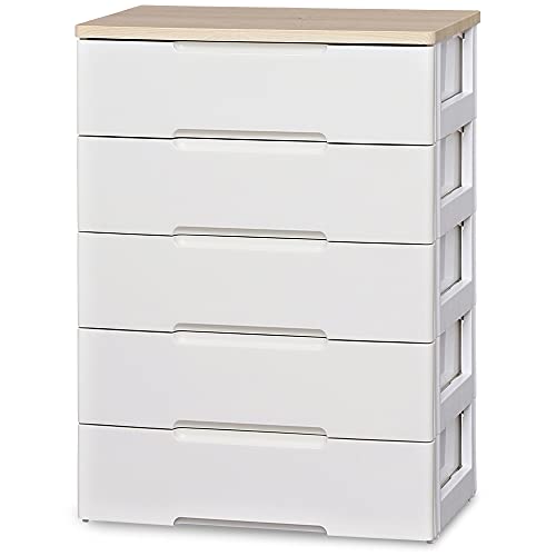 アイリスオーヤマ チェスト 5段 届いてすぐ使える完成品 ラクラク引出し 木天板 日本製 幅73×奥行41.5×高さ100cm ホワイト / ナチュラル 白 プラスチック HG-725R 組立不要