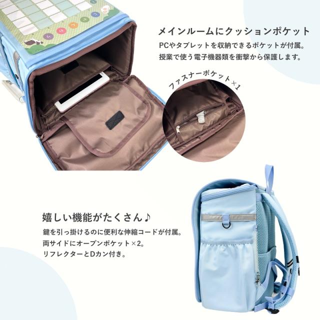 【内側ポケット】時間割りポケット×1、名前ホルダー×1、オープンポケット×2、ファスナーポケット×2、PCポケット×1
