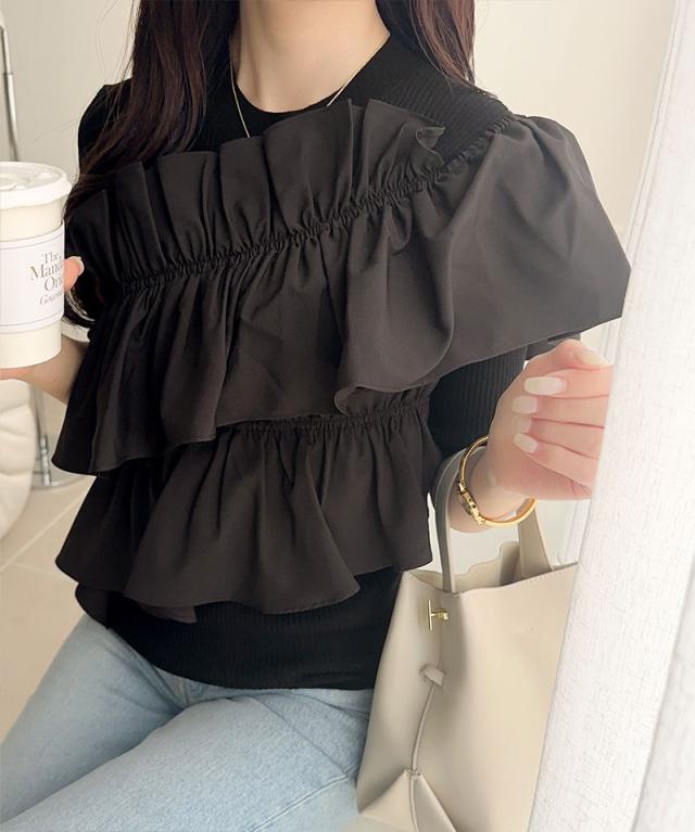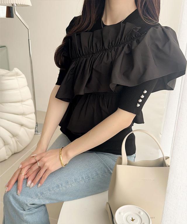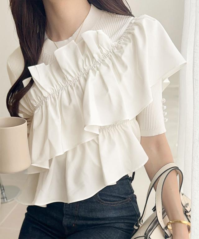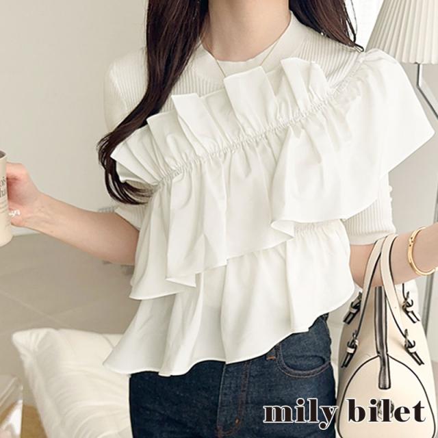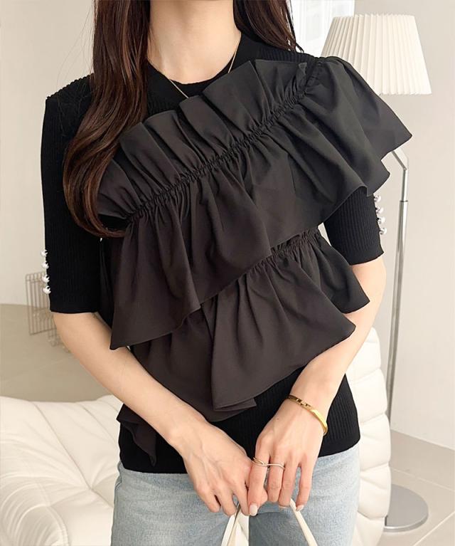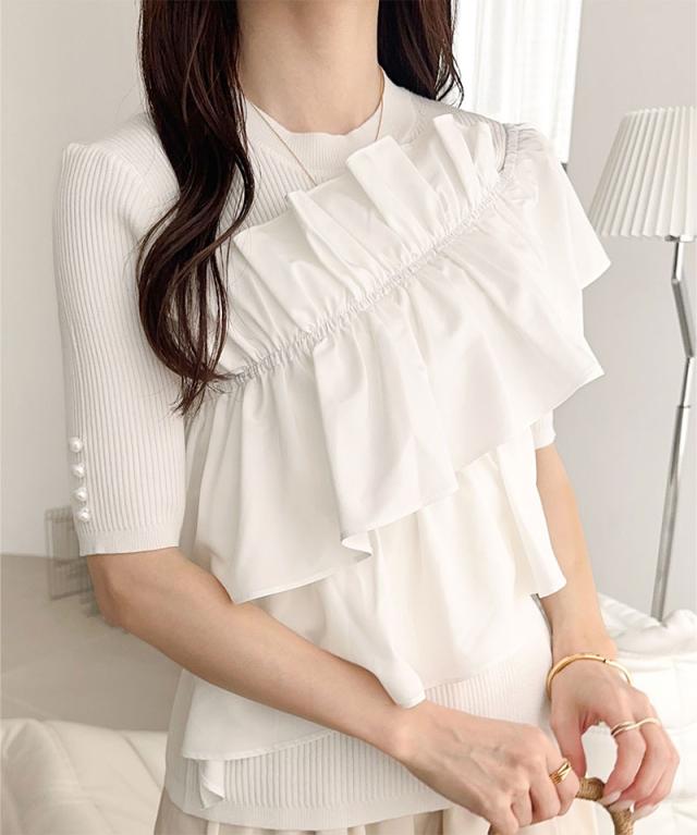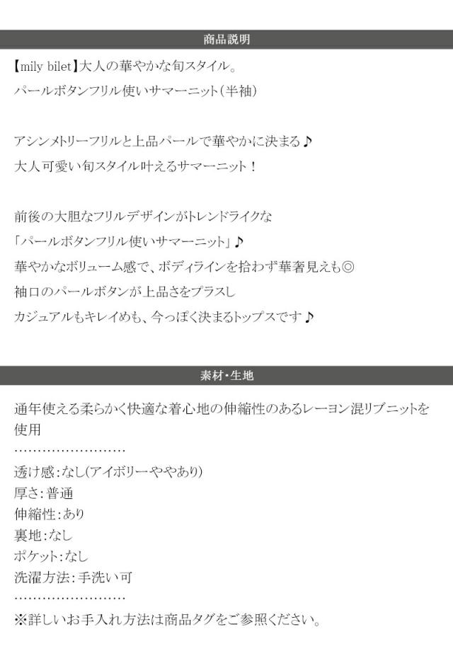 クラシカルエルフ春新作 mily bilet メール便送料無料トップス ニット レディース パールボタン アシンメトリー 華やか フリル使い サマーニット 半袖 華奢見え スタイルアップ 体型カバー 大きいサイズ 2026ss mi1139080