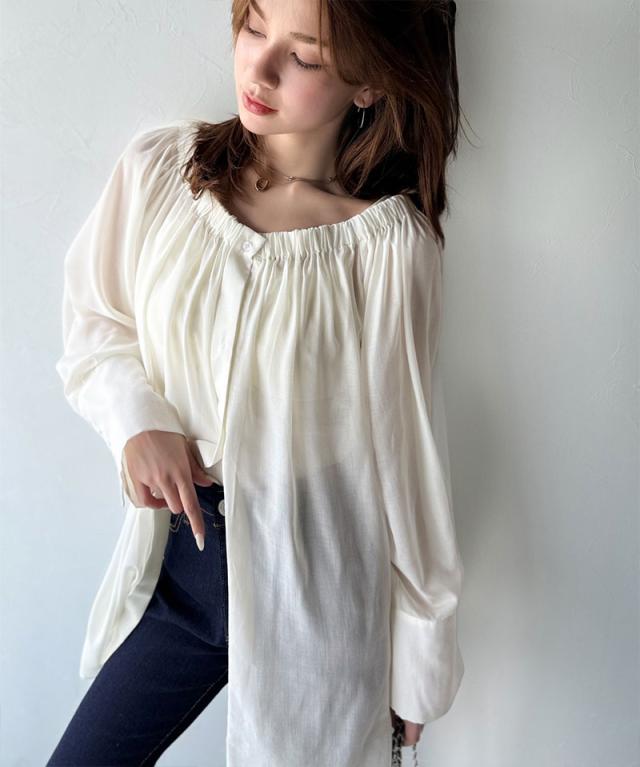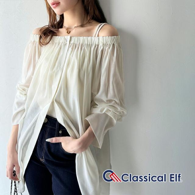 クラシカルエルフ春新作 トップス ブラウス レディース 2way オフショルダー チュニック ギャザー シアー シャツ 長袖 首元 ゴム 仕様 体型カバー 大きいサイズ 2026ss ce1110119