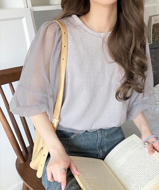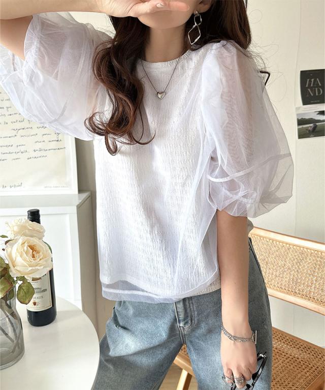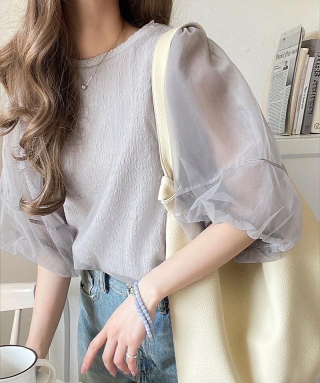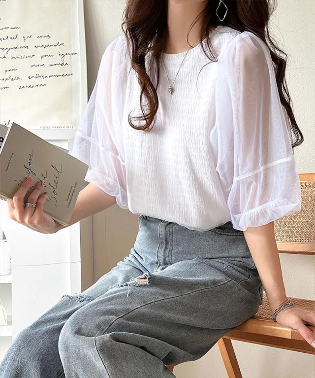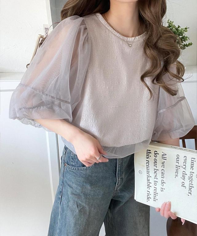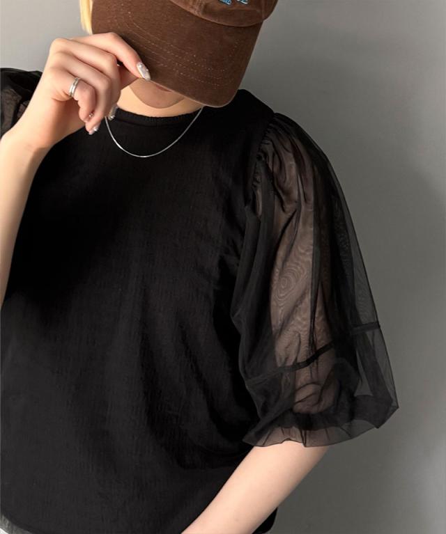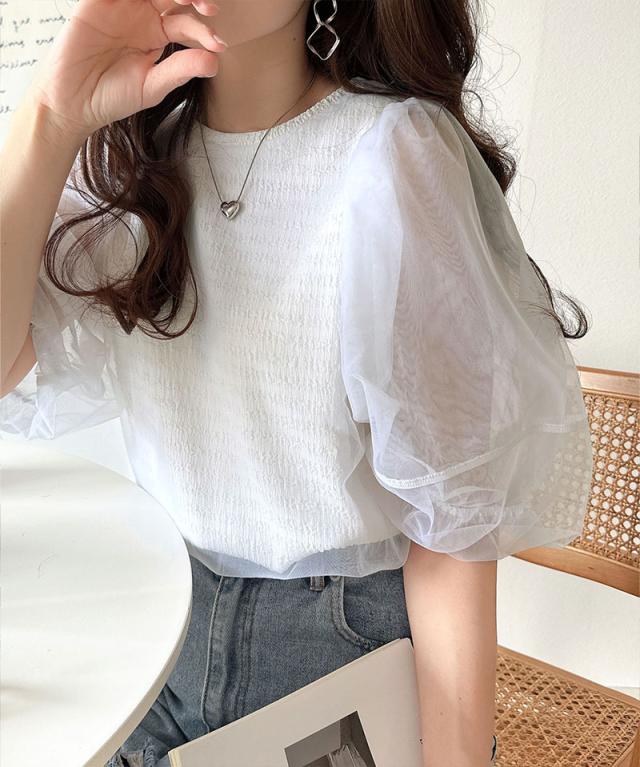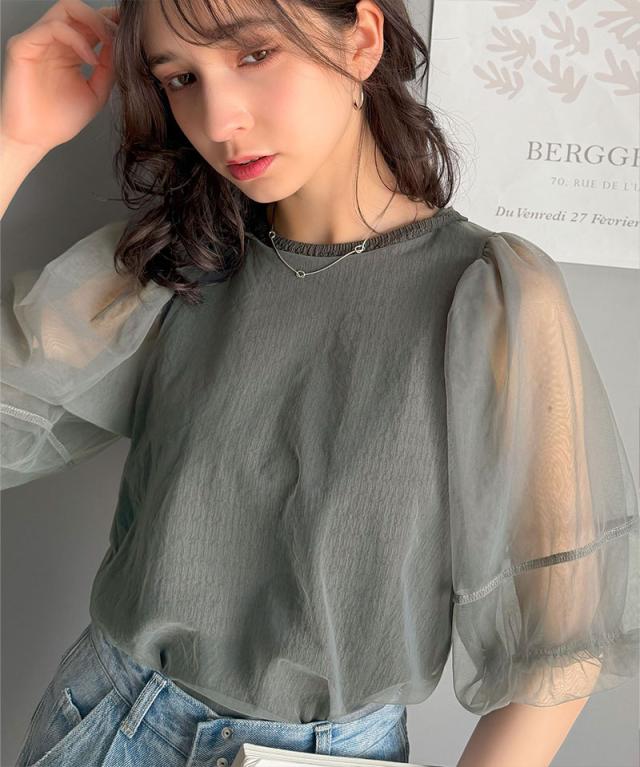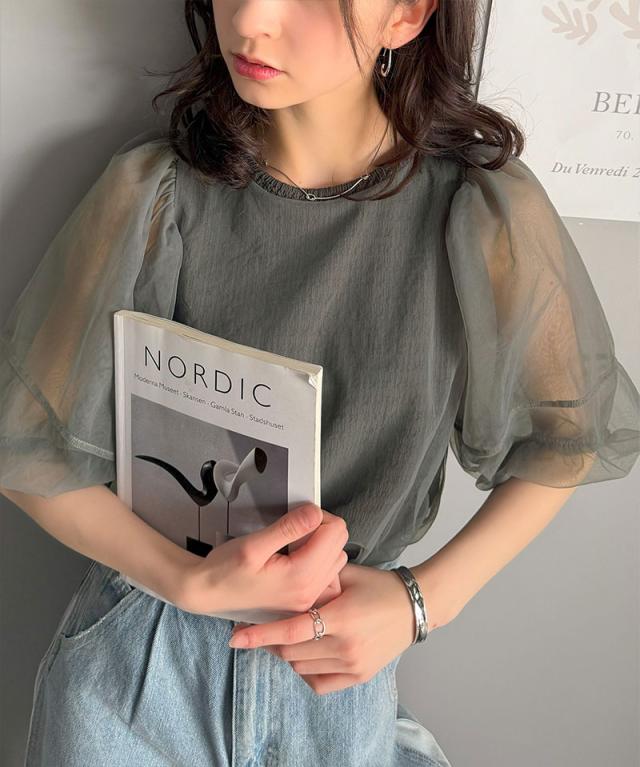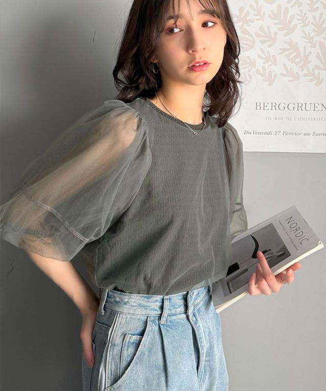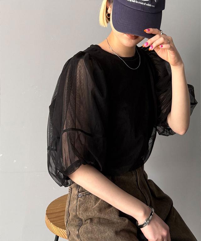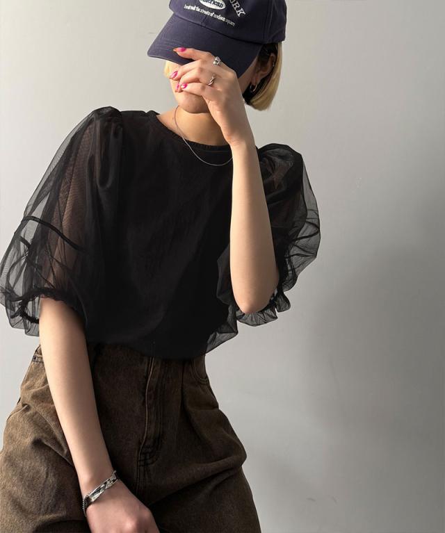 トレンドのチュールスリーブが目を引くフェミニンプルオーバー。