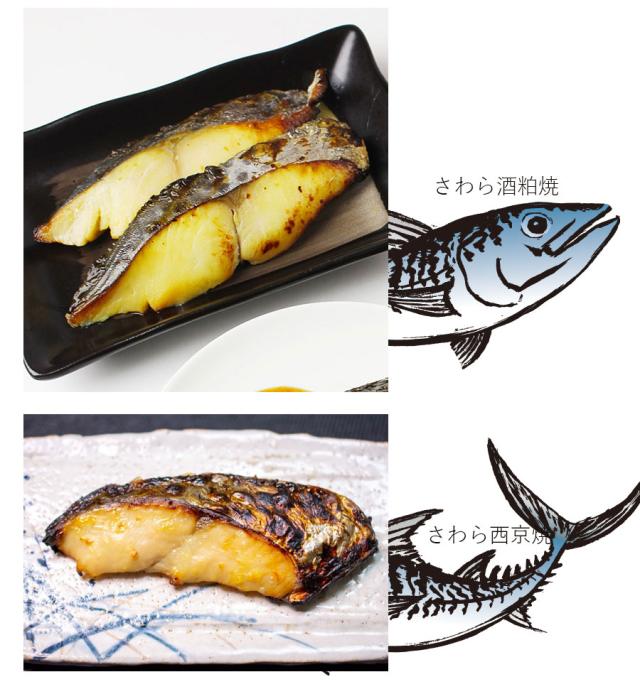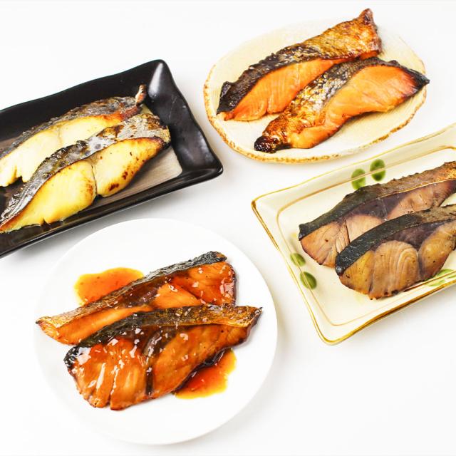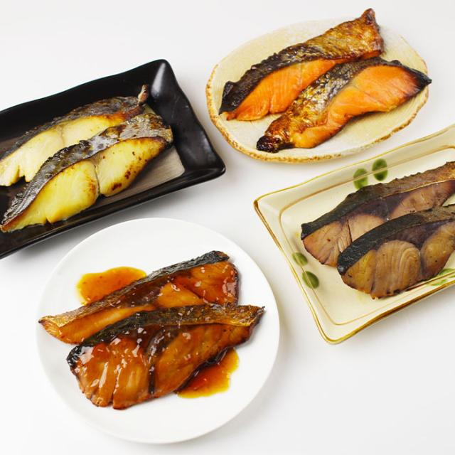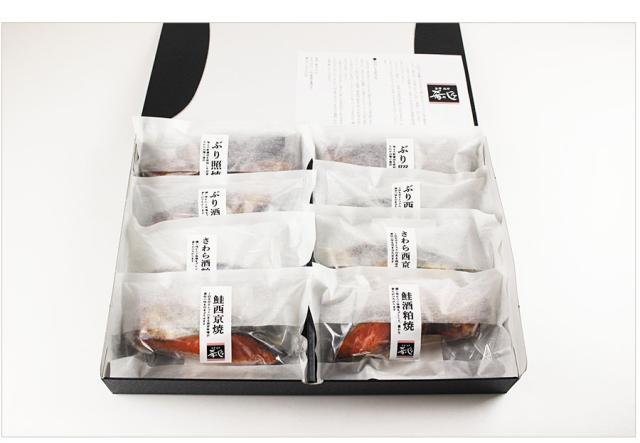 ○内容量:(ぶり照焼 1切)×2袋、(ぶり西京焼、ぶり酒粕焼、さけ西京焼、さけ酒粕焼、さわら西京焼、さわら酒粕焼 各1切)×各1袋 合計8袋