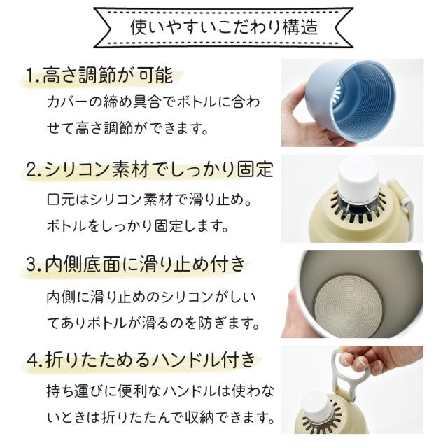 カバーの締め具合で高さが調整できるので、様々なサイズのペットボトルに対応します。