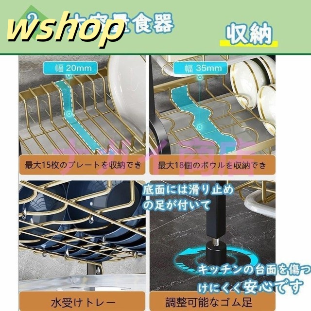 大容量食器収納:キッチンの2段ディッシュラックでカウンタートップを有効に活用しましょう。1段目には、果物や野菜、コーヒーポット、で16枚のプレートを収納できます。 2段目には、ボウル、皿、ボトルなど、 18個のボウルを収納でき、限られたキッチンカウンターにぴったりです。