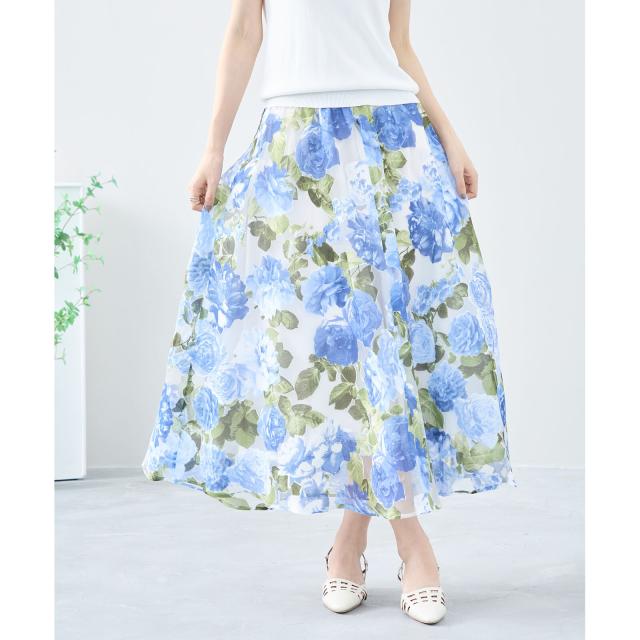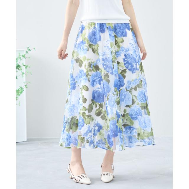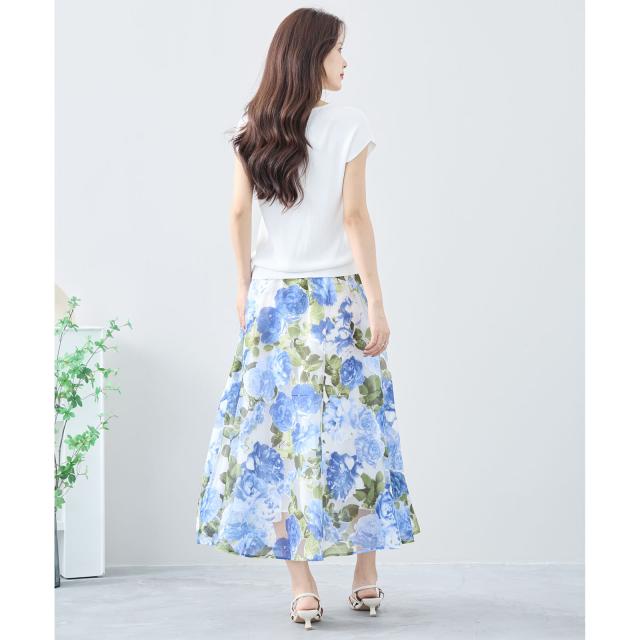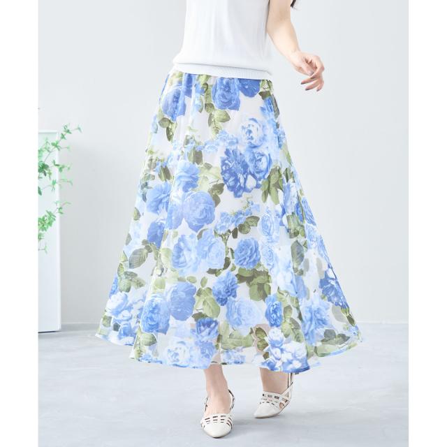 夏らしいレトロな雰囲気の大花柄スカート。ふんわり感あるAラインシルエットが上品さをUP。