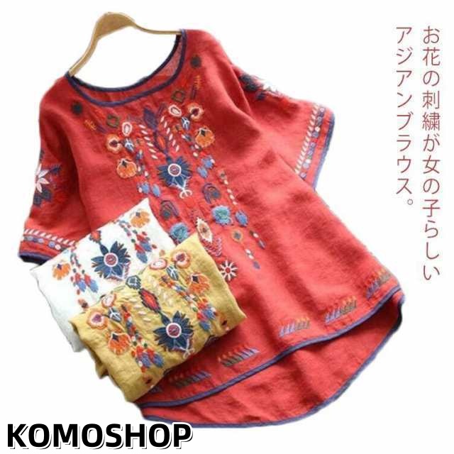 ブラウス レディース 半袖 Tシャツ トップス 花柄刺繍 半袖シャツ アジアン エスニック ラウンドテール レディース プルオーバー 薄手 カ