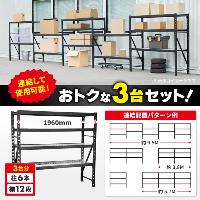 【3台セット】 スチールラック 4段 ボルトレス ブラック ワイド幅 業務用 収納棚 中量棚 メタルラック 耐久性あり 400kg 頑丈 高強度 幅196×奥行61.5×高さ183cm KIKAIYA
