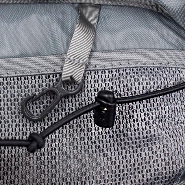 外側のバンジーはレインジャケットや同様のかさばるアイテムを収納できます。