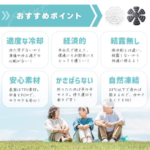 帽子やヘルメットに簡単INしてクールダウン♪【28度以下で自然凍結!】PCM素材で、人体に無害、無臭、半永久で使用でき結露もしない!しかも冷やさなくても28度以下で固まり、ヒンヤリ!ほてった熱を吸収!冷蔵庫や冷凍庫、冷水だと早く固まりつめた〜い♪そんな万能最先端素材を使用!また、簡単INで老若男女問わずお使頂けます!外でのアクティブな使用、アウトドア、お子様の公園遊び、自転車のヘルメット、被り物を幅広くサポート。結露もしないので、安心してご使用できます。