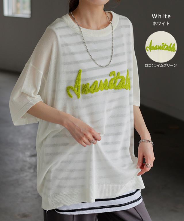Tシャツ 透かし編みニット ロゴ 刺繍 レディース ■ トップス 半袖 ニット ロング ティーシャツ チュニック ビッグ クルーネック 長い ドルマン 無地 体型カバー お尻が隠れる 大きいサイズ 立体 おしゃれ 白 黒 春 夏 HUG.U メール便