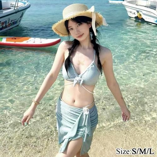 水着 レディース ビーチウェア スイムウェア 流行 海 プール ビキニ ストリング スリット フェミニン パール ビキニ 体形カバー ブルー S M L ビキニ