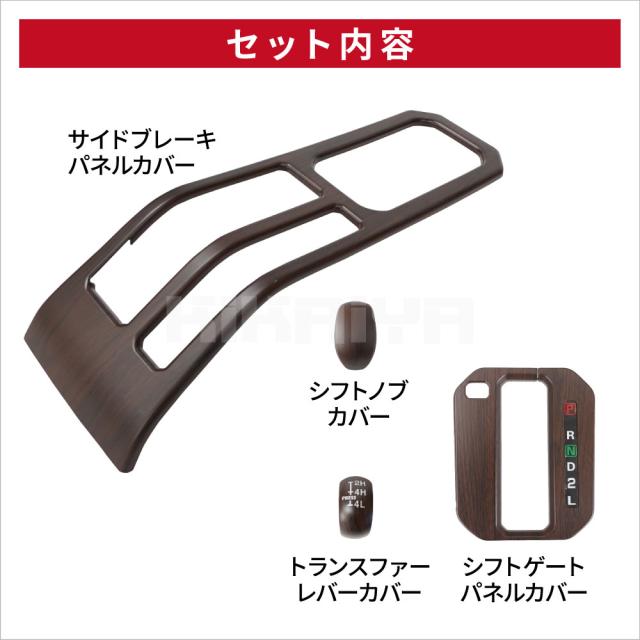 | セット内容 | ・サイドブレーキパネルカバー ×1 ・シフトノブカバー ×1 ・トランスファーレバーカバー ×1 ・シフトゲートパネルカバー ×1 両面テープ貼り付け済 |