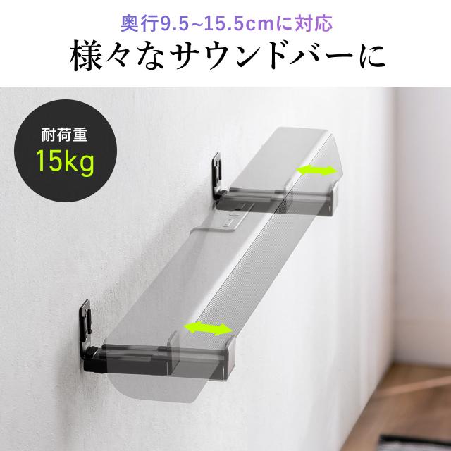 ●奥行9.5〜15.5cmまで調整可能、耐荷重15kgまで対応し、さまざまなサウンドバーに対応します。