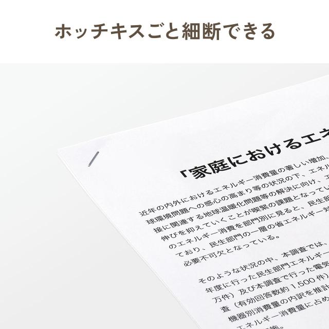 ●ホッチキスの10号針を付けたまま、最大4枚まで同時に細断可能です。