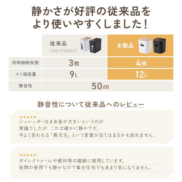 静音シュレッダー コンパクトシュレッダー パーソナルシュレッダー 電動シュレッダー マイクロカット ホッチキス対応 最大4枚 12L ブラック ホワイト[400-PSD071]