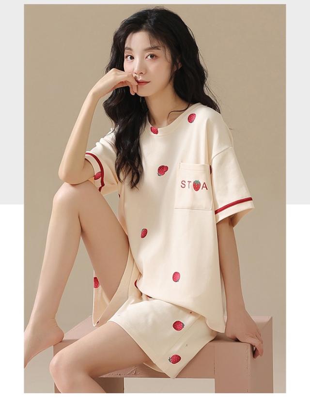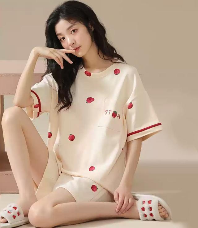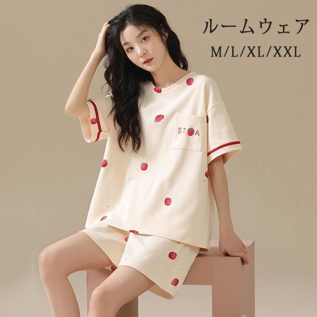 パジャマ レディース 夏用 いちご柄 半袖 綿 上下セット 2点セット 部屋着 寝間着 ルームウェア 大きいサイズ ぽっちゃり 夏用 秋用 可愛い かわいい 薄手 サマーパジャマ ゆったり 女性 リラックス おしゃれ 誕生日 ギフト 結婚祝い プレゼント ベージュ