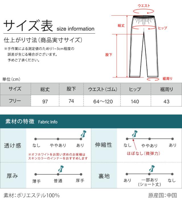 フリー:総丈97、股下74、ウエスト(ゴム)64〜120、ヒップ140、裾周り43 ※平置き実寸サイズです。手作業による測定値の為、1-3cm程度の誤差がある場合があります。予めご了承下さいませ。 |